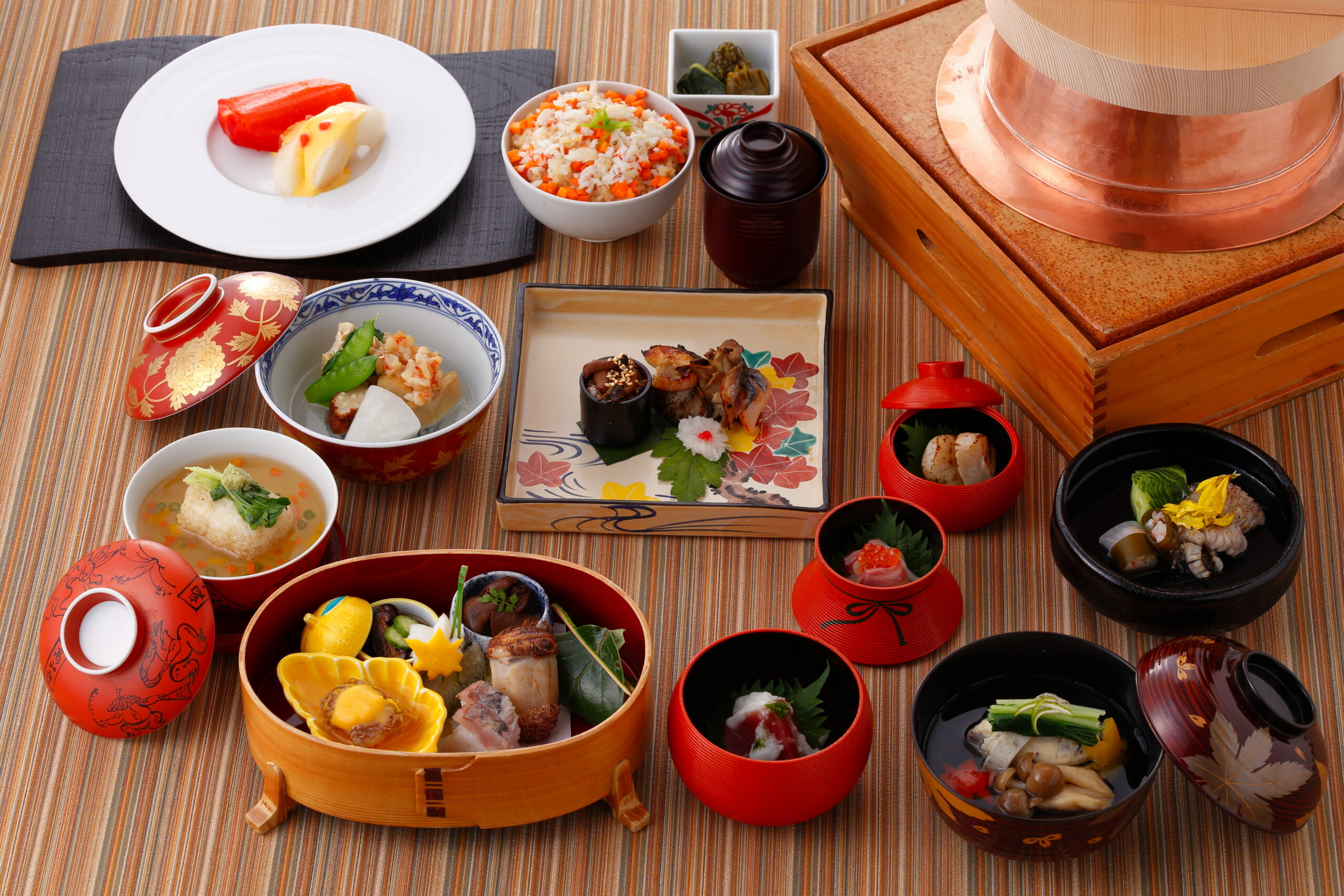 「神楽月(かぐらづき)」特別会席 京料理 たん熊北店 ランチディナー 販売期間 11月1日(土)~11月30日(日) 料金 ¥15,180 MENU 御 献 立 前 菜 ・柚子香合 茶ぶり生子このわた和え 車胡瓜 ・猪口入 鯛肝有馬煮 木の芽 ・小皿盛 蟹身錦玉寄せ 黄味酢がけ ・秋鯖小袖寿司 ・松茸小芋 ・松葉差し 紅葉有平・子持ち若布 ・柿の葉包み胡桃胡麻餅 向 付 本鮪 山かけ 青海苔 天然白身魚イクラ巻 平貝炙り あしらい一式 天塩 土佐醤油 椀 盛 清し汁仕立 鶉真蒸 のり板麩 占地 水菜 紅葉パプリカ 折松葉柚子 焼 物 鰆味噌幽庵舞茸包み焼 菊花蕪 猪口入 占地・榎茸佃煮 焚 合 海老芋海老そぼろがけ 絹さや 湯葉 菊菜 粟麩 明太子玉締め 蕪 ふり柚子 蒸 物 稔り饅頭 白身魚・椎茸入 貝割菜 山葵 五目あんかけ 酢 の 物 千枚巻 黄味酢がけ 針ラディッシュ 伝助穴子焼霜 菊花ジュレ 酢 蛇腹胡瓜 止 椀 赤出し汁 御 飯 釜炊き 金時人参と白身魚入御飯 三つ葉ちらし 香 の 物 三種盛り 水 菓 子 洋梨 アングレーズソース 石榴ちらし 熟柿 RESTAURANT レストラン一覧 レストラン&バーLevel 36 中国レストラン 蘇州 鉄板焼 北野 日本料理 神戸 なだ万 寿司割烹 尽 京料理 たん熊北店 カジュアルダイニングザ・テラス ティーラウンジザ・ラウンジ メインバーザ・バー